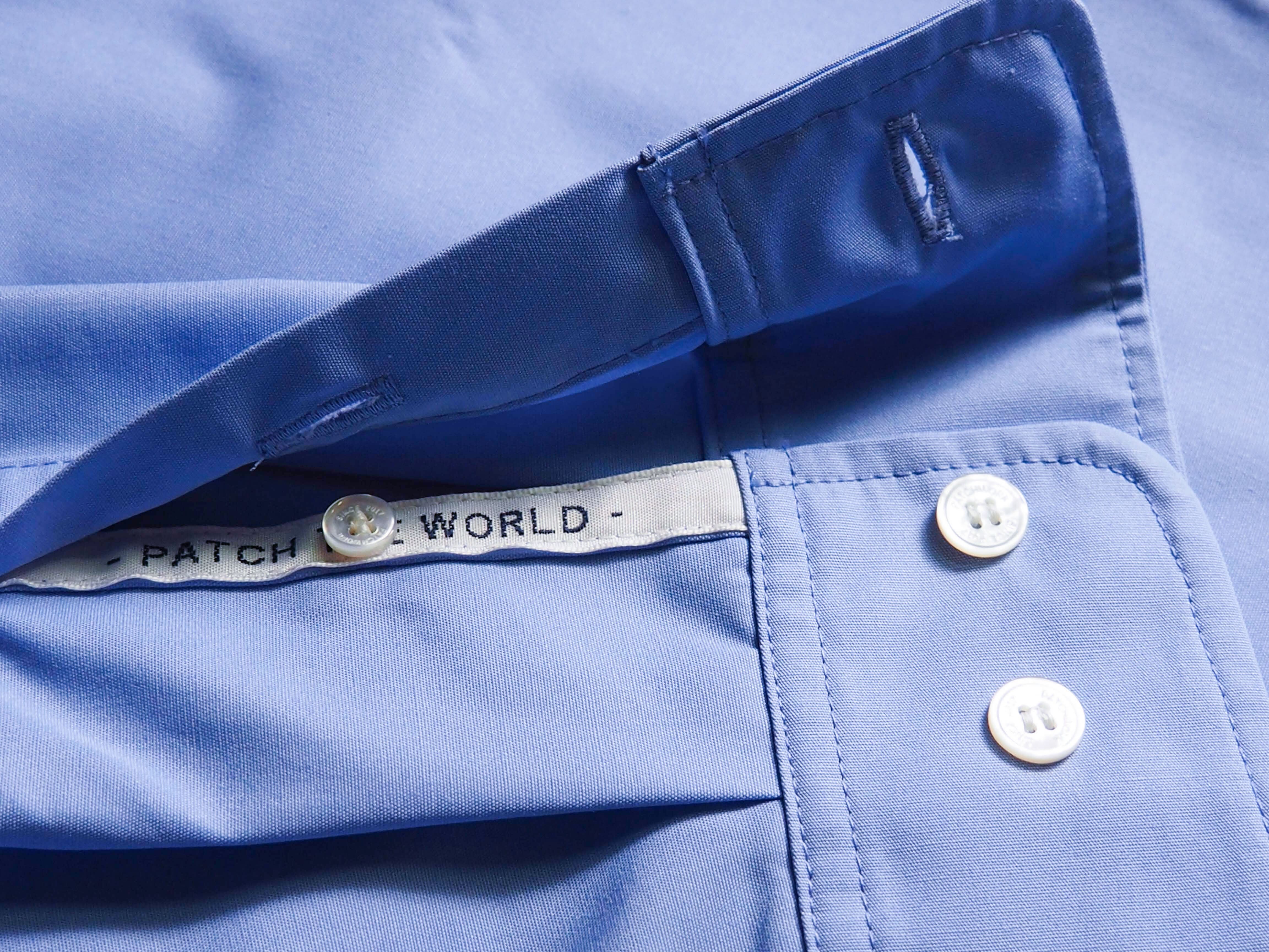 ・袖ボタンを開けると見える「Patch the world」の文字